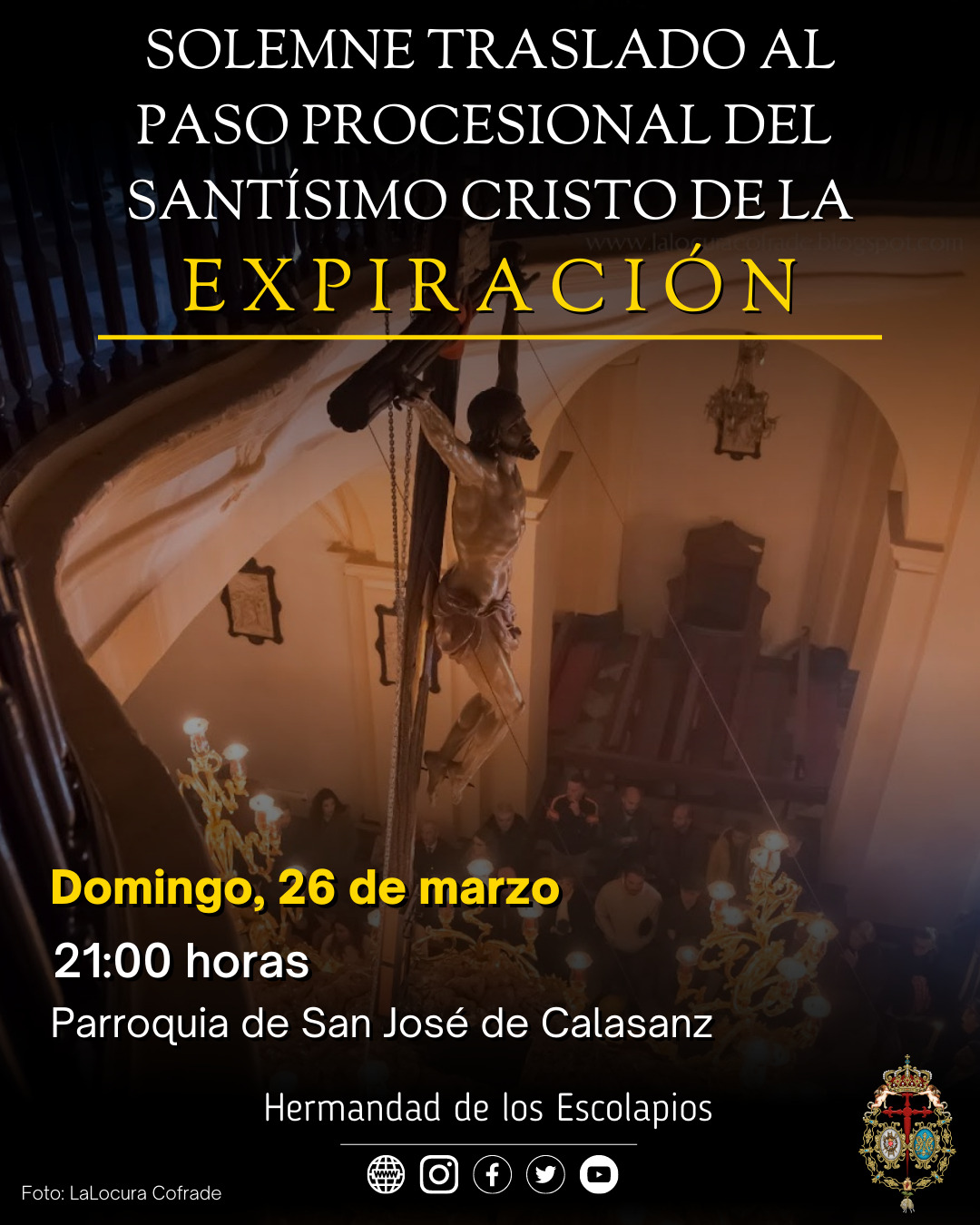 Este domingo, 26 de marzo, tendrá lugar el Solemne Besapiés a nuestro Amantísimo Titular el Santísimo Cristo de la Expiración en nuestra sede canónica de San José de Calasanz, dando comienzo a las 11:00h y finalizando a las 20:00h, interrumpiéndose este horario por la celebración de las Eucaristía a las 11:30h ; 12:30h y 13:30h.
